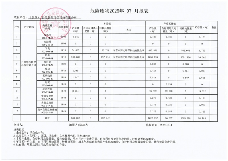 危险废物产生2025年7月份报表|日照磐岳环保科技有限公司-mg不朽情缘爆分大奖